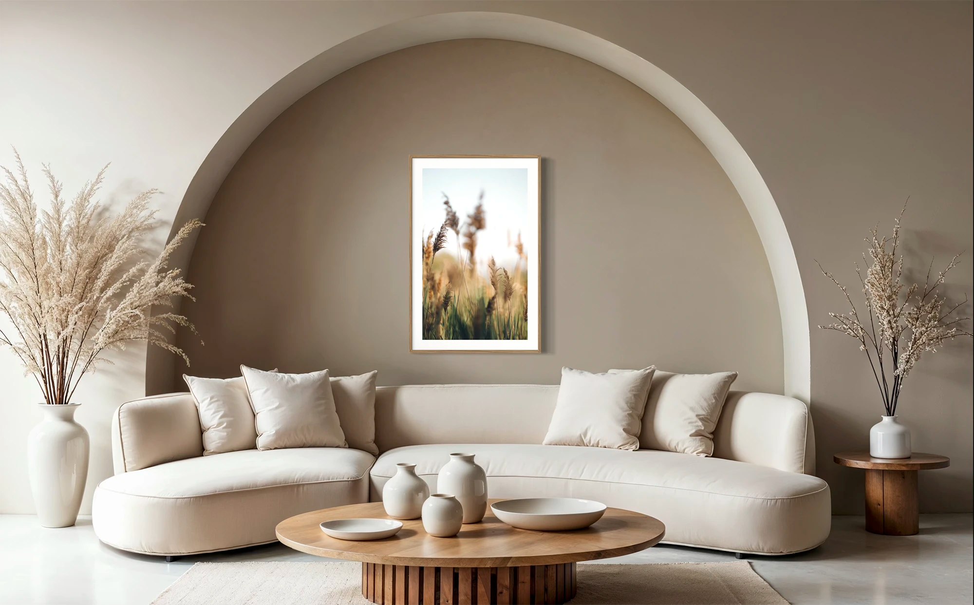 Le style méditerranéen fait un retour remarqué, modernisé par des lignes plus épurées et une attention portée aux matières naturelles : pierres, terre cuite, rotin, corde de marin ou encore bois flotté. Les couleurs rappellent la mer et les citronniers : bleu profond, jaune solaire, vert olive, blanc chaud. On y retrouve l’esprit des maisons de vacances du sud. Un style parfait pour créer une atmosphère apaisante et vivante à la fois, propice à la détente. Des tirages d’art représentant des couchers de soleil, des photos de mer, des volets colorés apportent une touche vivante sans alourdir l’espace. Pour une finition parfaite et en accord avec ce style, choisissez un cadre en bois naturel ou une caisse américaine chêne. Pour une note plus artisanale, vous pouvez poser votre photo d’art directement sur des étagères en pierre ou en bois flotté.