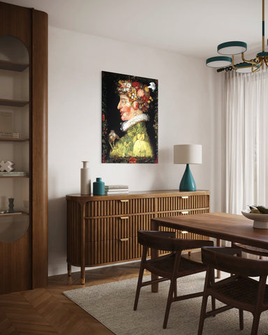 Découvrez Le Printemps, chef-d’œuvre de Giuseppe Arcimboldo, célébrant la renaissance de la nature à travers un portrait unique et inventif. Ce visage est entièrement composé de fleurs, bourgeons et jeunes feuilles, illustrant l’abondance et la vitalité de la saison printanière. Chaque détail révèle le talent exceptionnel du peintre maniériste, transformant la nature en un tableau peinture riche et poétique, où observation minutieuse et imagination se rencontrent.