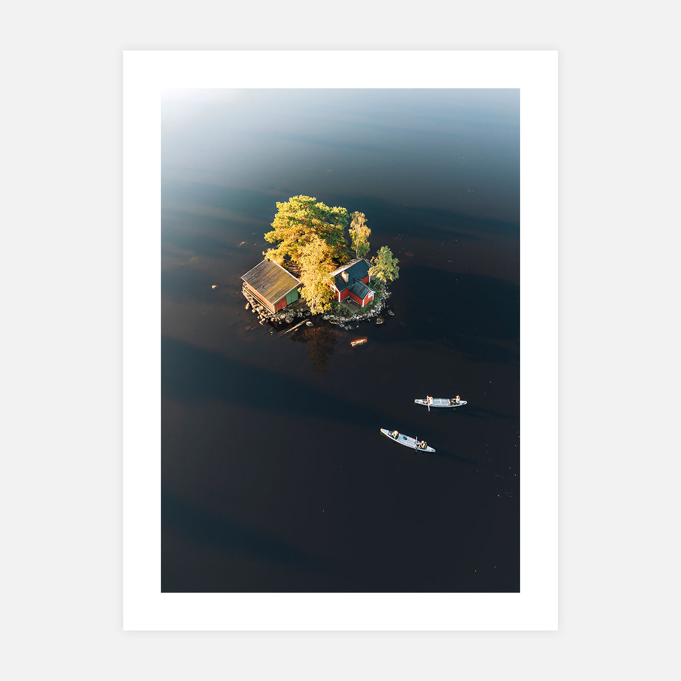 Ilôt paradisiaque dans les lacs suédois au coeur de la réserve naturelle de Halen. Cette vue aérienne prise par Maxime Coquard, photographe du duo des Bestjobers saisit un instant de sérénité pure. On peut apercevoir deux maisons rouges typiquement scandinaves, bordées d'arbres et deux canoës sur l'eau. Une photographie qui respire le calme et l'équilibre, idéale pour une décoration épurée, nature et inspirante.