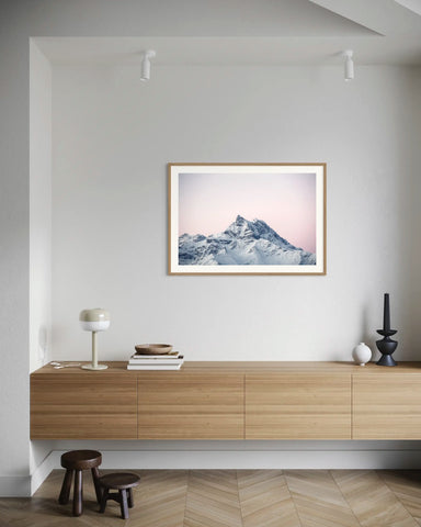 Lever de soleil sur les Alpes Suisses : une affiche déco de montagne avec un fond rosé grâce au lever du soleil. Une affiche déco aux teintes douces pour les murs d'une chambre d'enfant ou d'un séjour.