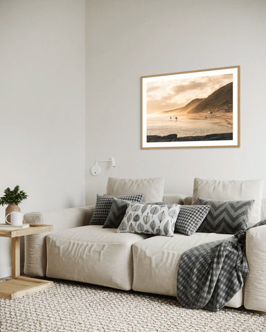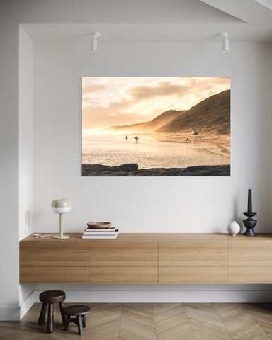 Session de surf à l’heure dorée en Australie (Esperance). Photo d'art prise par les Bestjobers lors d'un voyage en Australie. Découvrez une affiche déco d'art pleine de sérénité et de couleurs douces pour une déco murale intérieure unique.