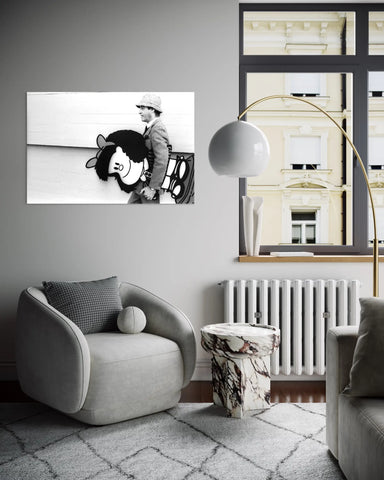 La silhouette reconnaissable de Mafalda contraste avec la présence discrète de Quino, créant une image à la fois tendre, malicieuse et chargée de sens. Cette image vintage parle autant de bande dessinée que de liberté d’expression, d’humour engagé et de regard critique sur le monde, valeurs portées par Mafalda depuis sa création.