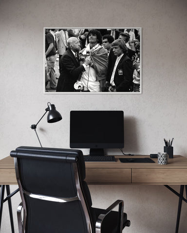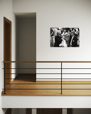 Un micro à la main, encore porté par l’euphorie de sa victoire, Yannick Noah savoure l’instant. Ce portrait en noir et blanc, capturé juste après sa victoire à l’Open de France 1983, est une image sur le sport profondément humaine, où l’émotion brute s’invite au cœur de la scène.