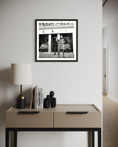 Yves Saint Laurent devant sa boutique - Photo d'art