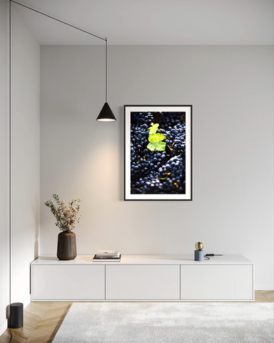Cette photo d'art de Nicolas Démoulin capture la beauté d'une feuille de vigne se détachant d'une profusion de grappes de raisin. La feuille semble flotter dans une mer généreuse de raisins, symbole d'équilibre entre force et délicatesse.