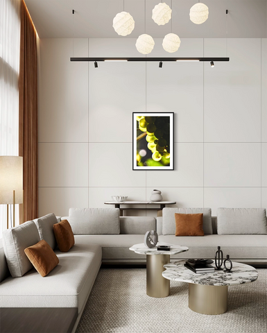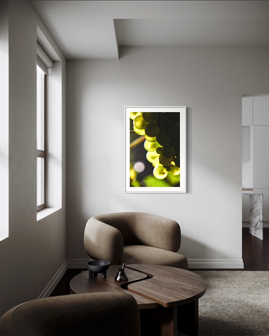 La photo d'art, intitulée Transparence, capture la magie d'un instant : les grappes de raisins baignées de lumière, révélant la finesse et la transparence de chaque baie sous le soleil. Le contre-jour met en valeur les nuances dorées et vertes du fruit, offrant une image à la fois poétique et vibrante.