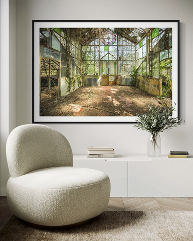 Photographe d'exploration urbaine, Florent Devauchel capture la beauté oubliée des lieux abandonnés. La photo De vert en verre, révèle une serre endormie au coeur d'un parc thermal toscan classé à l'UNESCO. Derrière les murs envahissent de verdure, la nature reprend ses droits, transformant le déclin en poésie.