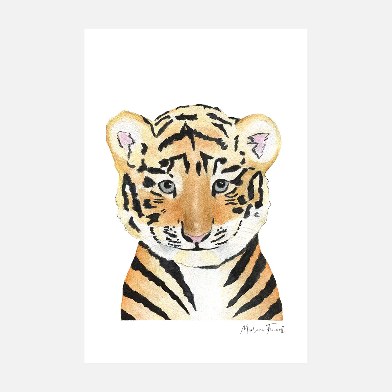 Découvrez Charly, un adorable bébé tigre peint à l'aquarelle, dont le regard malicieux et le sourire en coin ne manqueront pas de vous faire craquer.