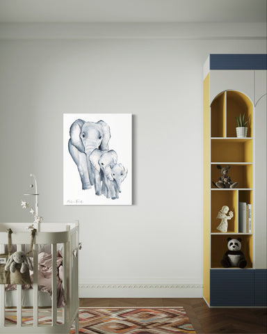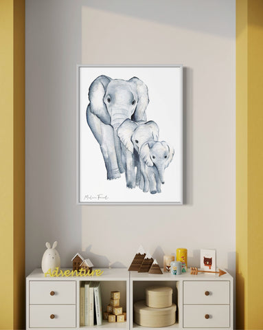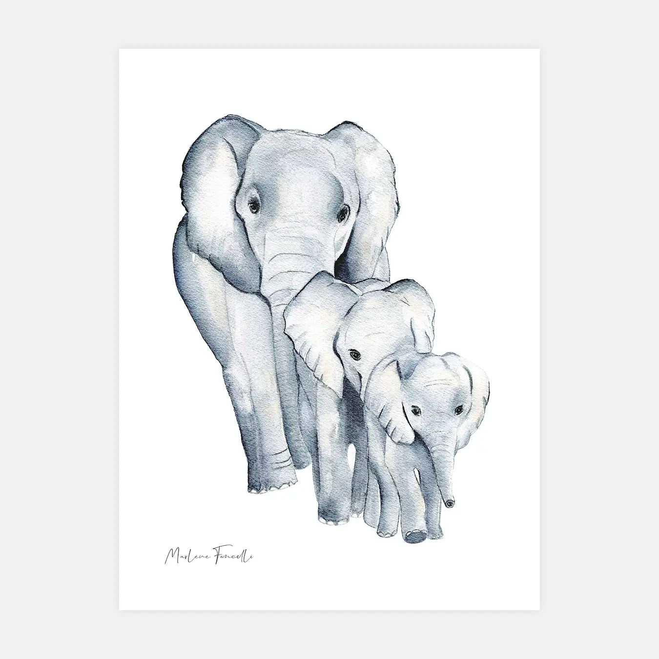 Dans cette délicate peinture à l'aquarelle, une mère éléphant avance avec calme, guidant ses deux petits, l'un devant l'autre, dans une harmonie de mouvements pleine de tendresse.