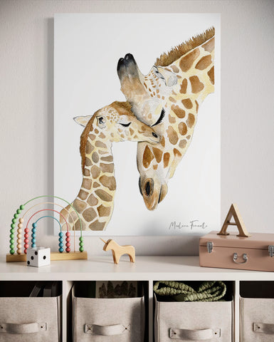 Cette reproduction de peinture imprimée en qualité galerie capture un instant de tendresse entre une maman girafe et son petit. Un moment câlin, tout en douceur, symbole universel de protection et d'amour maternel, qui invite à la sérénité et à l'émerveillement.