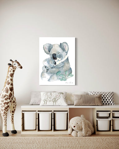 Cette reproduction d'aquarelle imprimée en qualité galerie met en scène une famille de koalas blottie dans un moment de câlin tendre et rassurant. La chaleur de ce geste simple exprime toute la beauté des liens familiaux et la douceur protectrice de l'amour maternel.