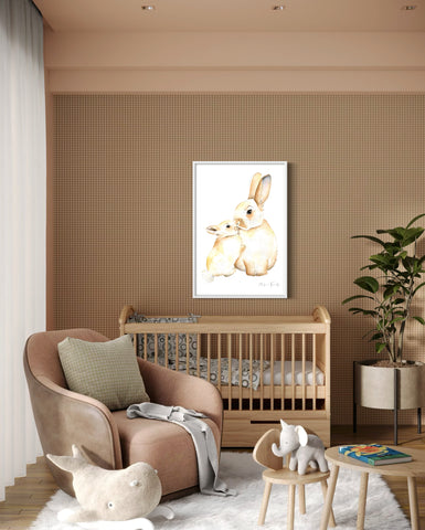 Cette peinture en aquarelle capture un moment rempli de douceur entre une maman lapin et son petit. Sur la pointe des pattes, le bébé lapin s'étire pour déposer un bisous sur le museau de sa maman. Une scène attendrissante qui évoque la complicité, la bienveillance et l'amour familiale.