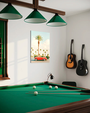 Plongez au cœur du mythe californien avec cette photo d’art iconique mettant en scène une Cadillac rouge flamboyante garée sous les palmiers majestueux de Palm Springs. Véritable hommage à l’esthétique rétro américaine, cette image capture l’essence même du rêve californien : couleurs vibrantes, soleil éclatant, lignes vintage et atmosphère résolument feel good.