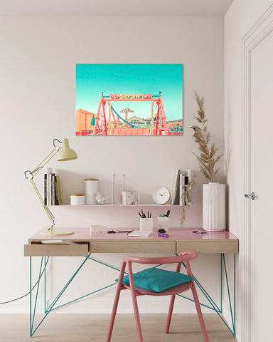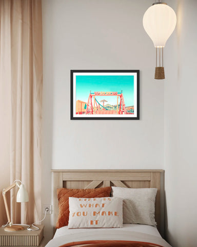 Souvenirs d'été à la fête foraine prise par Hélène Havard lors de l'un de ses voyages. Cette photographe d'art est inspirée par les voyages et capture ce que l'on ne voit pas forcément. Photographie paysage colorée pour une décoration rétro et gaie. Cette photo a été prise dans une fête foraine aux Etats-Unis. Sa composition avec ses couleurs pétantes flashy nous plonge dans l'univers coloré et enfantin des fêtes foraines. Retrouvez d'autres affiches pour chambre d'enfant.
