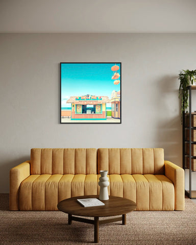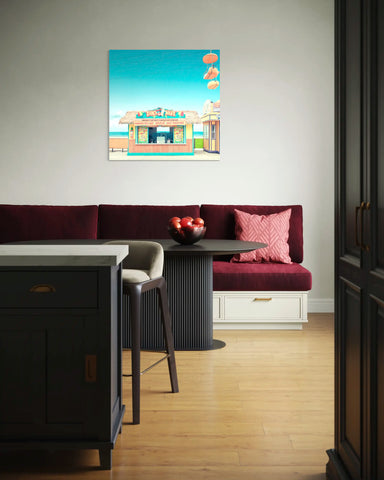 Conseils déco : Cette photo d'art est idéale pour un salon, un bureau ou un espace bar à la maison pour donner une atmosphère cool et détente. Combinez-la avec d’autres photographies de bord de mer ou photos vintage de la Californie pour un mur galerie thématique. Pour un style plus ludique, ajoutez des objets colorés rappelant les vacances : lampes néon, bouées décoratives, petits accessoires en bois flotté.