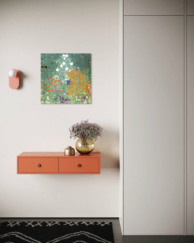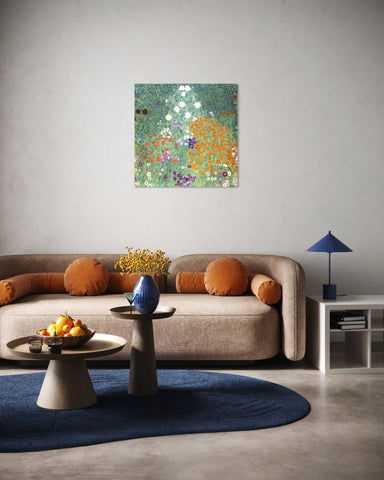Impression et reproduction du tableau Jardin de fleurs, de Gustav Klimt, peint à l'huile sur toile en 1907 avec des tons chauds. Tableau décoratif pour une décoration murale florale et originale.