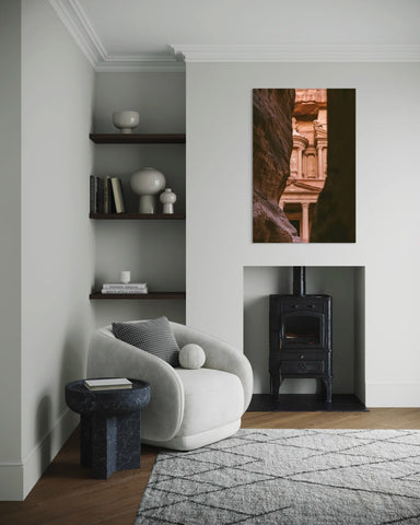 Entrez dans l’intimité d’un lieu chargé d’histoire et de mystère. À travers les ombres massives des canyons jordaniens, la cité antique de Petra se dresse, véritable joyau architectural. Une art photo qui capte la magie de la lumière et la puissance du silence.