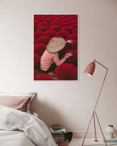 Cette photo voyage saisissante nous transporte dans ce champ d’encens rouge vif, au cœur du Vietnam. Cette femme, coiffée du célèbre chapeau conique, y travaille avec précision. Son visage dissimulé renforce le mystère et la poésie de la scène, laissant toute la place à l’ambiance et aux couleurs vives de cette photo d'art.