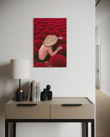 Véritable image colorée, cette composition hypnotise par ses tons rouges profonds et ses contrastes graphiques. Elle capte l’âme d’un savoir-faire ancestral et rend hommage aux gestes silencieux du quotidien vietnamien.