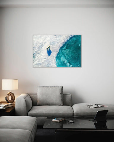 Photograhie prise en vue aérienne d'un paysage polaire avec un ours qui se déplace sur sa banquise. La photo d'art a été prise sur l'Île de Baffin, Nunavut au Canada par Florian Ledoux.