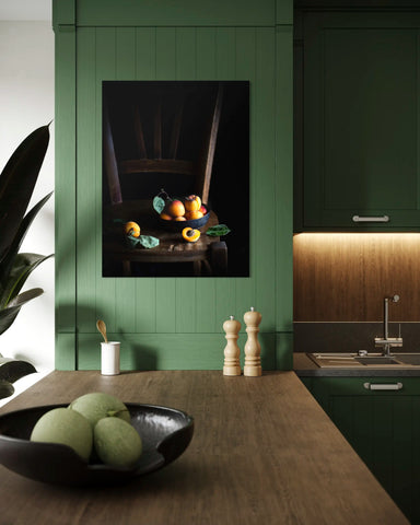 Conseils déco : Avec ses couleurs chaudes et son ambiance naturelle, cette œuvre trouve parfaitement sa place dans une cuisine, une salle à manger ou un intérieur au style campagne chic, méditerranéen ou bohème. Elle apporte une touche gourmande et rétro, idéale pour créer un mur décoratif harmonieux. Pour accentuer cette atmosphère douce, associez-la à d’autres visuels de fruits, de matières rustiques ou de scènes culinaires, dans un ensemble inspiré de la photographie d’art traditionnelle. Le bois clair, la céramique artisanale et les teintes abricot ou terracotta se marieront particulièrement bien avec cette image.
