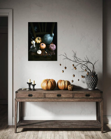 Conseils déco : Parfaite pour instaurer une ambiance automnale et cosy, cette œuvre s’intègre très bien dans une cuisine, une salle à manger ou un salon au style rustique, vintage ou même scandinave. Elle apporte une touche chaleureuse et décorative inspirée des récoltes de saison. Pour un mur harmonieux, combinez-la avec d’autres visuels autour des légumes, des teintes orangées ou de scènes d’automne comme Bouquet de couleurs de Marc Chesneau ou encore Florescence de Zoé Pignolet.