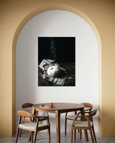 Cette photographie d’art capture le geste simple et authentique du façonnage de la pâte à pain, mettant en valeur la texture de la farine et la chaleur du moment. L’image reflète le plaisir des recettes maison et le charme du quotidien culinaire, avec une touche vintage qui souligne l’authenticité de la scène. Elle s’inscrit parfaitement dans l’univers de la photo food et constitue une image d’art gourmande et conviviale.