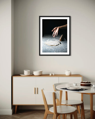 Cette photographie d’art saisit le moment simple et authentique de la cuisine pendant la préparation d’une pâte brisée, avec une lumière douce qui rappelle les après-midis de cuisine maison. Les textures de la farine et de la pâte apportent une dimension chaleureuse et tactile à l’image. Elle s’inscrit parfaitement dans l’univers de la photo pâtisserie et de la photo d’art culinaire, tout en adoptant une esthétique légèrement vintage qui évoque les recettes traditionnelles et les gestes transmis en famille.