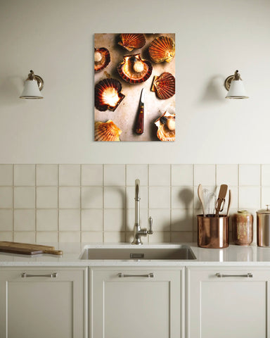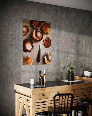 Conseils déco : Cette image s’intègre parfaitement dans une cuisine moderne, une salle à manger ou un espace à l’ambiance littorale. Elle se marie particulièrement bien avec une déco méditerranéenne, des teintes sable, bleu doux ou blanc cassé, ainsi qu’avec des matières naturelles comme le bois clair, la corde ou la céramique texturée. Pour créer un mur thématique élégant, associez-la à d’autres photographies comme 1 2 3 soleil de Florian Gruet dont les couleurs de la photo rappellent parfaitement la coquille des Saint-Jacques. Également, de belles illustrations comme Coquillages et crustacés, Omar m’a pincé ou même Sous les pavés de Ségolène Teillauchet.