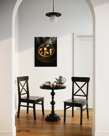 Cette photographie d’art met en scène un panier garni de pommes, délicatement posé sur un châle, dans une ambiance douce et chaleureuse. Les couleurs automnales et les textures naturelles créent une nature morte élégante, mettant en valeur la richesse des images de fruits et la simplicité authentique du quotidien. L’ensemble dégage un charme vintage, avec une touche poétique qui évoque les récoltes de saison et le plaisir des gestes traditionnels.
