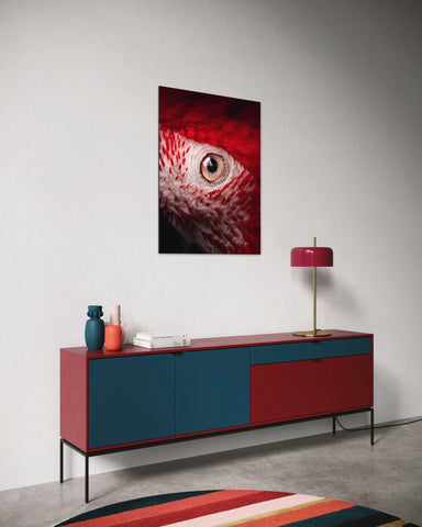 Cette œuvre dépasse la simple image d’animaux : elle capture l’intensité du regard et la puissance émotionnelle de l’oiseau, faisant de cette réalisation une véritable photo d’art. Chaque détail du plumage rouge éclatant révèle toute la richesse de la nature sauvage, avec un regard fascinant qui nous fixe.