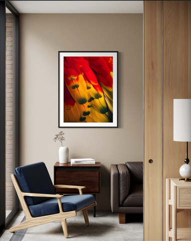 Réalisée par le photographe naturaliste Clément Maquair, cette photo artistique saisit toute l'élégance de l'ara. Chaque détail : la texture des plumes et la vivacité du plumage, en fait une véritable photo d'art et une pièce unique de photo animal.