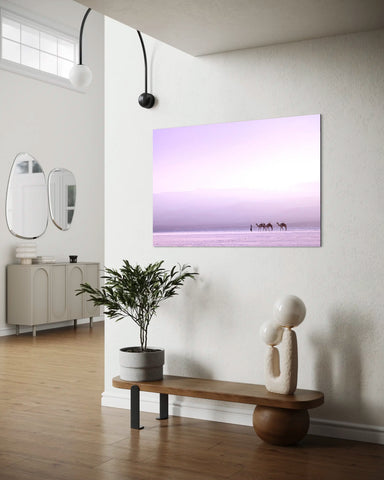 Idéale pour les amateurs de voyages, de grands espaces et de traditions ancestrales, cette photographie associe photo sur les animaux et photographie paysage dans une composition harmonieuse. La lumière du matin met en valeur les silhouettes des dromadaires et la blancheur du sel, offrant une image authentique et intemporelle aux nuances rosées.