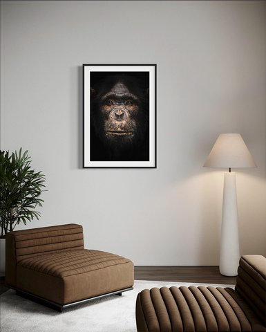 Ce portrait intense et expressif s'intègre idéalement dans un espace de contemplation : un salon épuré, un bureau ou une bibliothèque. En grand format, le regard du chimpanzé devient une présence presque humaine, une oeuvre forte qui suscite l'émotion et le dialogue.