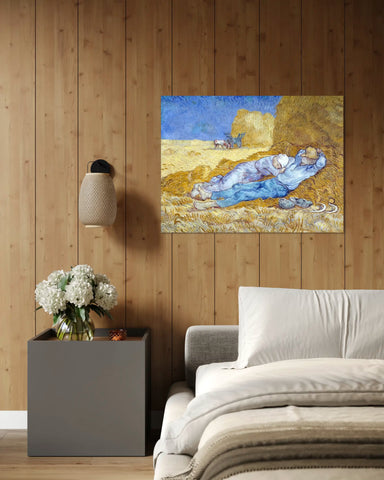 La Sieste, également connue sous le nom de La Méridienne, est une peinture à l’huile réalisée par Vincent Van Gogh en 1890. Inspirée de l’œuvre de Jean-François Millet, cette toile illustre deux paysans se reposant sur des meules de foin, en plein été, sous le soleil écrasant des champs. Par ses couleurs chaudes et son style expressif, ce tableau peinture rend hommage à la vie rurale et à la simplicité du quotidien.