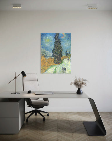 Peint en 1890 en Provence, Route avec un cyprès et une étoile est une œuvre emblématique de Vincent Van Gogh. Ce tableau peinture illustre un paysage nocturne vibrant, dominé par un majestueux cyprès et un ciel étoilé, typiques de l’univers artistique du maître postimpressionniste. L’équilibre entre les couleurs profondes et les touches lumineuses de la nuit témoigne du génie créatif de Van Gogh.
