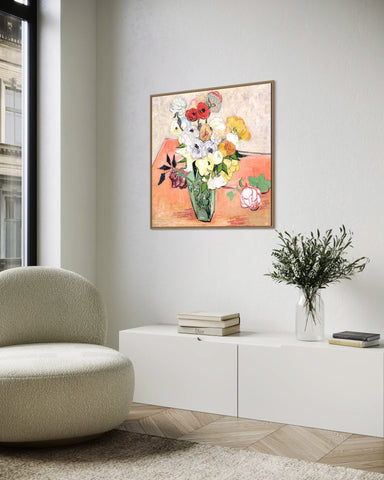 Réalisé en 1890, Vase japonais avec roses et anémones est une peinture à l’huile sur toile signée par le peintre post-impressionniste Vincent Van Gogh. Cette nature morte délicate représente un bouquet composé de roses et d’anémones dans un vase d’inspiration japonaise, témoignant de l’influence de l’art oriental dans l’œuvre du maître hollandais.